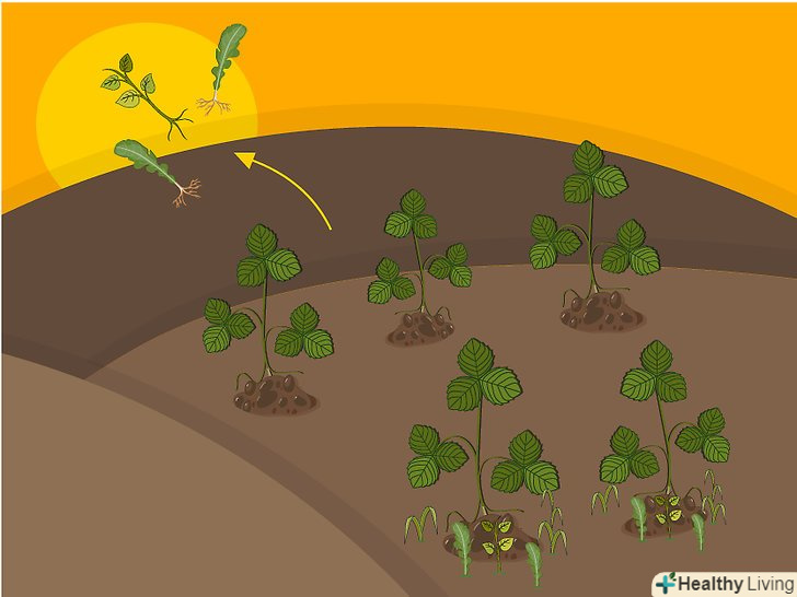 Прополювати суницю. Бур'яни можуть легко заглушити суницю, особливо недавно висаджені рослини. Раз в тиждень оглядайте грядку і вручну виривайте бур'яни разом з корінням. Між рядами можна використовувати сапку. [19]