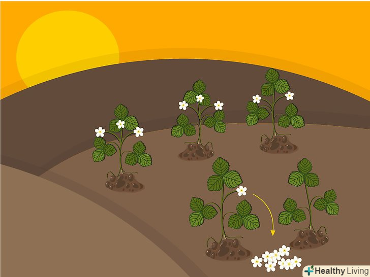 Обірвіть перші квіти. видаліть перші з'явилися квіти, щоб підстьобнути зростання суниці. Квіти можна зірвати руками або обрізати садовими ножицями. [20]- Якщо у вас плодоносний в червні сорт, Видаліть всі квіти в перший рік, щоб отримати урожай в наступному році. На наступний рік не обривайте квіти.