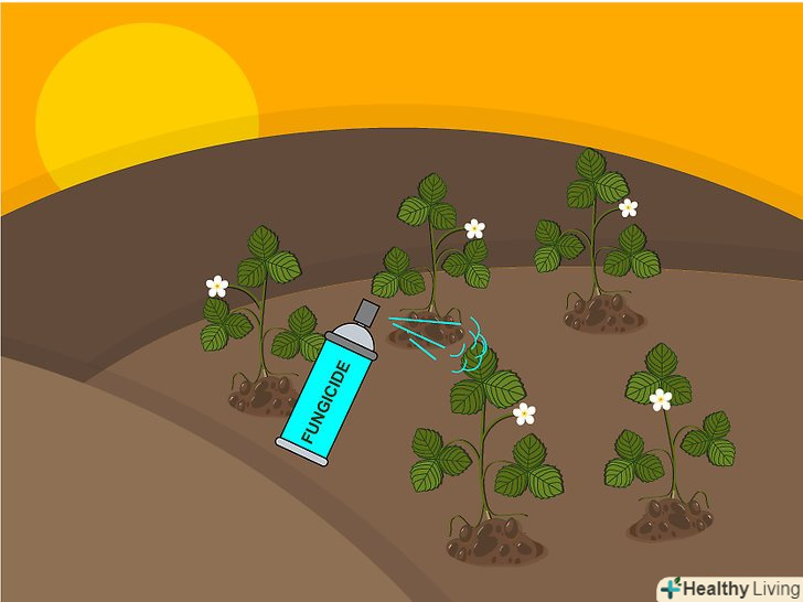 Використовуйте фунгіцид, щоб запобігти зараженню грибком. суниця схильна до багатьох грибкових захворювань, таким як борошниста роса або сіра цвіль. Придбайте фунгіцид, відповідний для використання в приміщеннях. На ньому має бути зазначено, що він годиться для суниці. Дотримуйтесь інструкцій щодо застосування. [22]- Якщо колір деяких листя зміниться або на них з'являться плями, обірвіть або зріжте їх, щоб запобігти поширенню хвороби.
