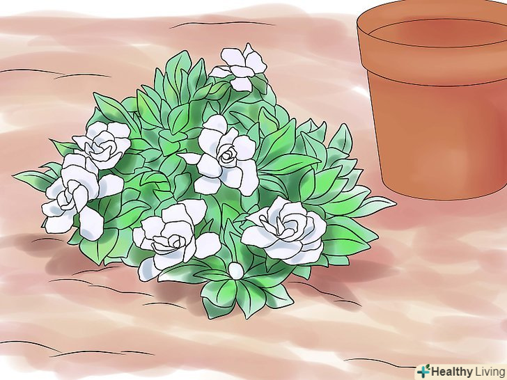 Посадіть рослину. вийміть з контейнера або мішковини коріння рослини. Покладіть коріння гарденії в ямку і засипте їх грунтом. Добре полийте рослину, щоб утрамбувати грунт.