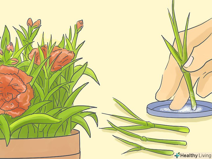 Зріжте живці гвоздики. живцювання - відмінний спосіб відтворення гвоздик, який можна застосувати через кілька років життя рослини. Перш, ніж зрізати держак, переконайтеся, що рослина здорово.- Рано вранці зріжте ділянку молодого втечі приблизно 4 дюйми завдовжки з тієї частини стебла, яка не цвіте. Робіть зріз під листовим вузлом. Ріжучі інструменти повинні бути гострими і чистими. Видаліть всі нижні листя.