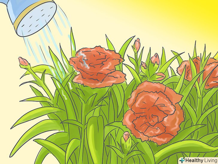 У суху погоду регулярно поливайте рослини. Квітучі круглий рік гвоздики зацвітуть повторно, якщо їх поливати під час сухої погоди.- Регулярний полив означає, що потрібно поливати гвоздики кожні 5-7 днів протягом літа, а в дуже суху і жарку погоду бажано поливати кожні 3 дні.
