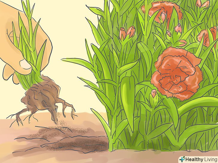 Щоб гвоздики були здоровими, регулярно діліть їх. через кілька років навіть квітучі круглий рік гвоздики не матимуть гарного вигляду. Ви можете омолодити гвоздики діленням коренів, щоб отримати нові рослини. Розподіл гвоздики:- Викопайте гвоздику і руками обережно розділіть кореневу масу. Посадіть окремо кожну відокремлену секцію і добре полийте. Поливайте протягом наступних кількох місяців, як тільки грунт нижче поверхні стає сухою.