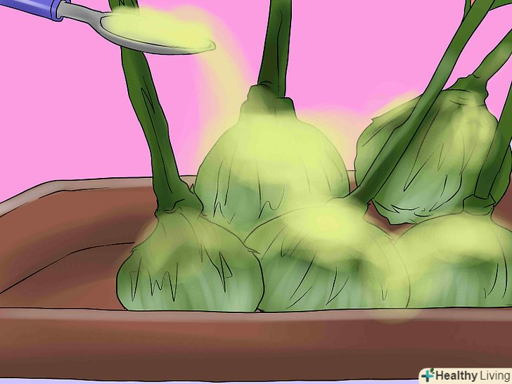 Присипте цибулини фунгіцидним порошком і помістіть їх на склад. після того, як цибулини просохли протягом декількох днів, присипте їх фунгіцидним порошком. Помістіть їх в паперові мішечки разом з невеликою кількістю сухого торф'яного моху або вермикуліту.- Також, ви можете використовувати картонну коробку, за умови, що ви зробите кілька вентиляційних отворів, щоб повітря могло вільно циркулювати всередині.