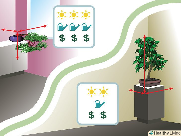 Підберіть розмір свого дерева бонсай. у дерев бонсай безліч варіацій в розмірах. Дорослі Дерева можуть досягати висоти від 15 см і до 90 см, в залежності від їх виду. Якщо ви вирішите вирощувати бонсай з саджанця або живця від іншого дерева, то вони можуть бути ще менше. Більш великим деревам потрібно більше води, грунту і сонячного світла, так що переконайтеся в наявності у вас всього цього перед тим, як зробити вибір.- Ось лише кілька факторів, які вам необхідно врахувати при виборі розміру вашого дерева бонсай: