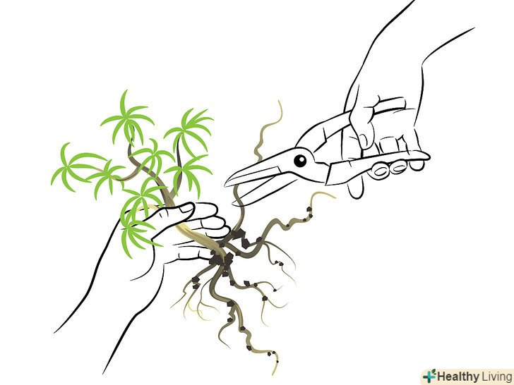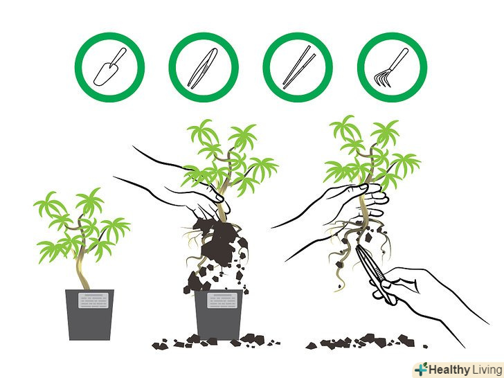 Вийміть дерево і очистіть коріння. обережно вийміть рослину з його старого горщика, переконавшись, що не поламали і не порвали його головне стебло. Вам може знадобитися лопатка, щоб витягнути рослину з горщика. Більшу частину коренів перед пересадкою в горщик треба буде обрізати. Однак щоб чітко побачити коріння, можливо, знадобиться відчистити їх від бруду. Очистіть коріння, видаляючи всі грудки бруду, які заважають вашому огляду. Зручними в цьому процесі виявляться граблі для коренів, палички для їжі, пінцет і схожі інструменти.- Коріння не повинні бути бездоганними – просто почистіть їх, щоб бачити, що ви робите при обрізанні.