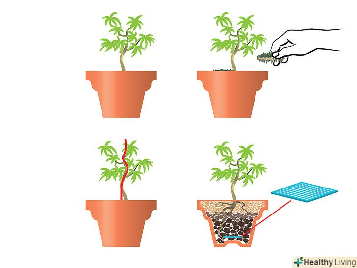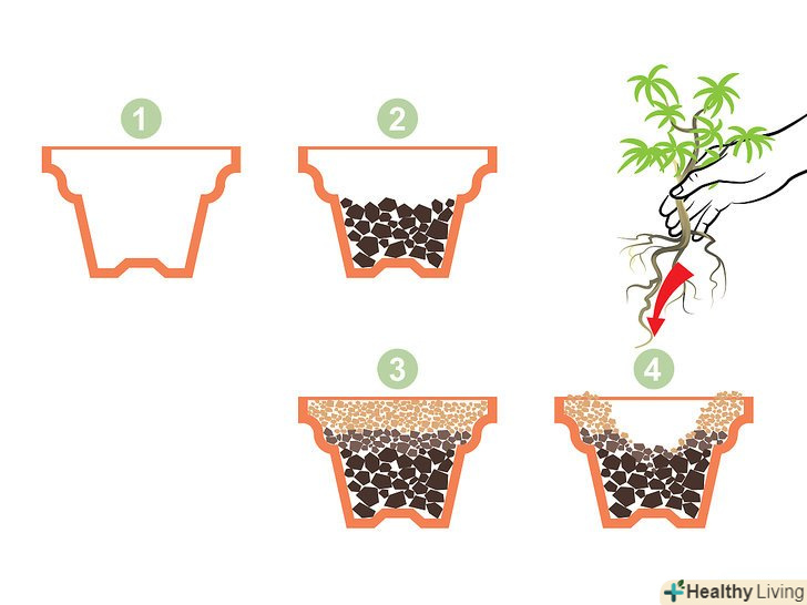 Підготуйте горщик. Перед тим як садити в нього рослина, переконайтеся, що в основі лежить шар свіжої нової грунту, причому достатньої висоти. На дні свого порожнього горщика насипте шар грубозернистого грунту, в якості основи. Потім, додайте більш дрібнозернистий пухкий грунт або живильне середовище. Використовуйте таку грунт або живильне середовище, яка добре сохне-звичайна садова земля може утримувати занадто багато води, і ви заллєте коріння. Залиште трохи місця у верхній частині горщика, щоб ви могли покрити землею коріння свого дерева.