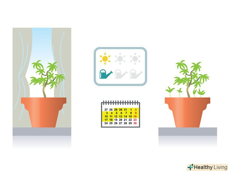 Доглядайте за своїм деревом бонсай. Ваше нове дерево тільки що пережило радикальний, в чомусь Травматичний процес. Протягом 2-3 тижнів після пересадки, залишайте його в півтіні, захищеному від вітру і інтенсивного прямого сонячного світла місці. [5] Поливайте рослину, але не користуйтеся добривами до тих пір, поки коріння не відновляться самостійно. Давши дереву» перепочинок " після пересадки, ви даєте йому можливість адаптуватися до нових умов і, з плином часу, розростатися далі.- Як було зазначено вище, Листяні дерева з щорічним життєвим циклом переживають навесні період інтенсивного росту. З цієї причини, найкраще пересаджувати Листяні дерева навесні, після закінчення їх зимового сну. Якщо ваше листяне дерево росте в приміщенні, після того, як воно приживеться після пересадки, вам слід перенести його на вулицю, де більш висока температура і більша кількість сонячного світла зможуть прискорити його природний «стрибок зростання».
