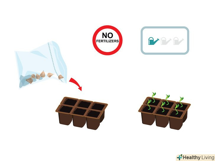 Помістіть свої саджанці в лоток для насіння або горщик. коли насіння почнуть давати сходи, Ви зможете пересадити їх в контейнер з невеликою кількістю грунту за своїм вибором. Якщо ви дали можливість насінню дати сходи природним шляхом, поза приміщенням, то вони, як правило, можуть залишатися в тому горщику, де проросли. Якщо ж ні, перемістіть свої здорові насіння з холодильника в лоток для насіння або маленький горщик. Викопайте в ньому невеликий отвір для насіння і закопайте їх так, щоб паростки йшли вгору, а їх корінці дивилися вниз. Відразу ж полийте насіння. З часом, спробуйте тримати грунт навколо місця посадки вологою, але не наскрізь мокрою, так як насіння можуть прогнити.- Протягом 5-6 тижнів не користуйтеся добривами, поки рослини не зможуть самостійно прижитися в нових контейнерах. Починайте з малого, використовуючи тільки незначну кількість добрива, інакше ви "спалите" молоді коріння, пошкодивши їх хімічними речовинами, що містяться в добриві.