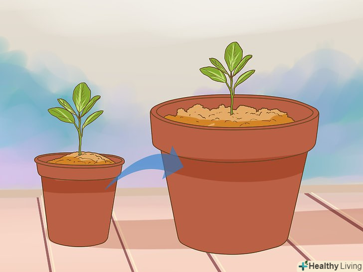 У міру зростання дерева пересаджуйте його в більш просторі горщики або у відкритий грунт. приблизно через рік пересадите рослину в горщик діаметром 25-30 сантиметрів. Після цього щороку в березні пересаджуйте його в більші горщики. Якщо ви живете в місцевості з досить теплим протягом усього року кліматом, можна пересадити дерево у відкритий грунт (виберіть освітлюване сонцем місце). [9]- Як правило, апельсинові дерева гинуть, якщо температура опускається нижче -4 °С, тому не пересаджуйте рослину у відкритий грунт, якщо ви живете в прохолодному кліматі.