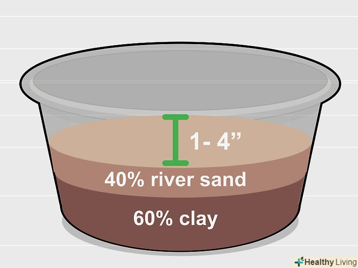 Засипте в ємність щільний грунт. для лотоса добре підійде суміш з 60% глини і 40% річкового піску. Залиште між рівнем грунту і верхніми краями горщика зазор 8-10 сантиметрів. [14]- Можна також взяти поліпшену грунт і насипати поверх неї шар піску товщиною 5-8 сантиметрів. Простежте, щоб залишалося достатньо місця між рівнем грунту і верхнім краєм ємності.