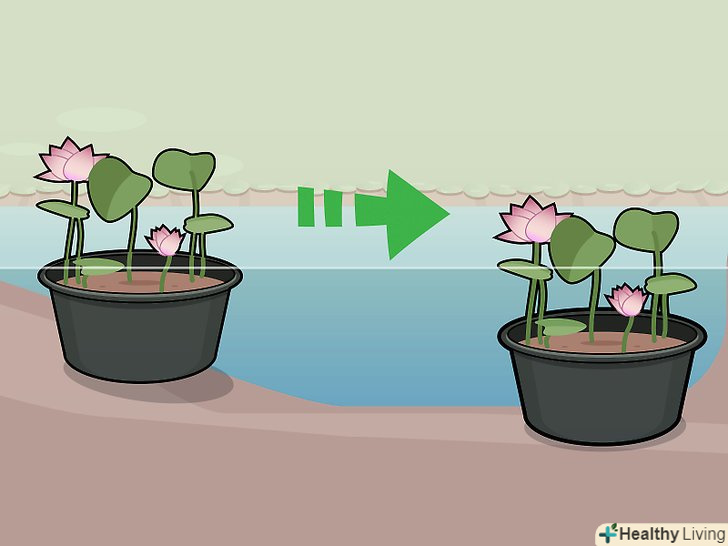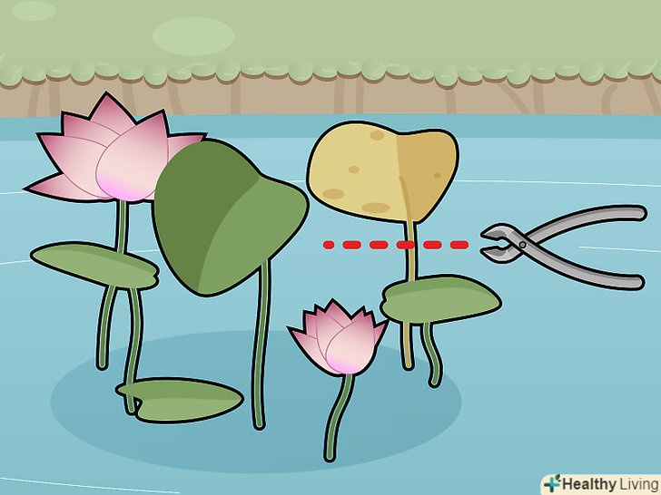 Зрізайте в'януть квіти і жовті або пошкоджені листя. якщо лотос почне поширюватися по ставку, можна також зрізати нові пагони, проте врахуйте, що він продовжить розростатися, поки навесні ви не пересадите його в нову ємність. [20]- Ні в якому разі не зрізайте квіти і стебла нижче рівня води. Стебла постачають коріння і цибулини киснем. [21]