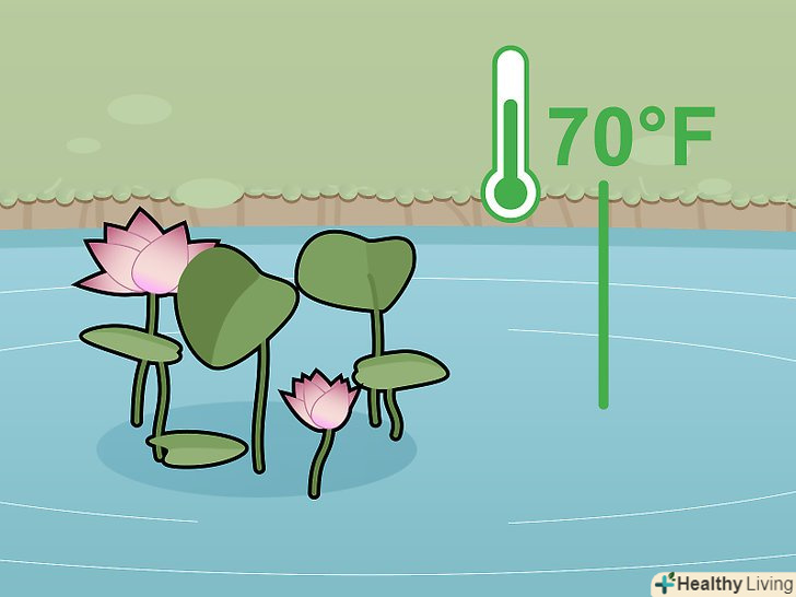 Слідкуйте, щоб температура води не опускалася нижче 21°C. при такій температурі лотос починає активно рости. Для нормального росту лотосу потрібна тепла вода. Найкраще, якщо температура повітря також не буде опускатися нижче 21°C. [17]- Якщо температура води не буде опускатися нижче 21°C, лотос випустить листя через кілька днів. При температурі води 27°C і вище рослина зацвіте через 3-4 тижні.