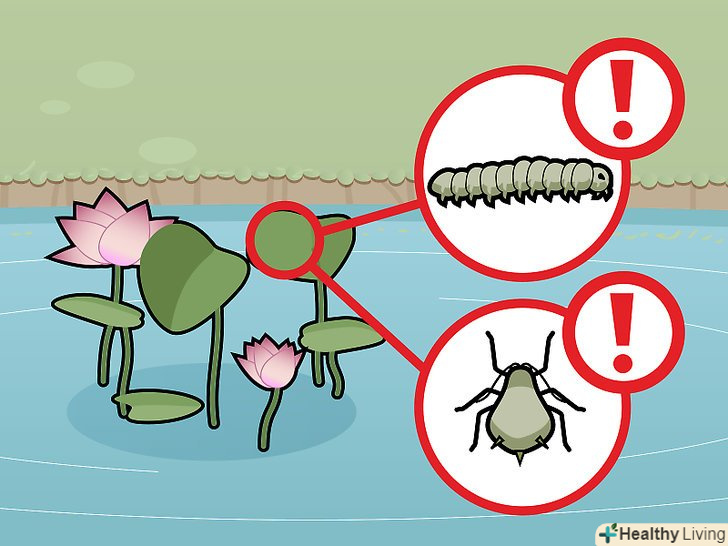 Слідкуйте за можливими шкідниками. хоча в різних регіонах можуть зустрічатися різні шкідники, листя лотоса часто залучають тлю і гусениць. Нанесіть невелику кількість пестицидів безпосередньо на листя, щоб захистити рослини від цих шкідників. [23]- Рідкі пестициди, в тому числі органічні, містять масла і миючі засоби, які можуть пошкодити лотоси.