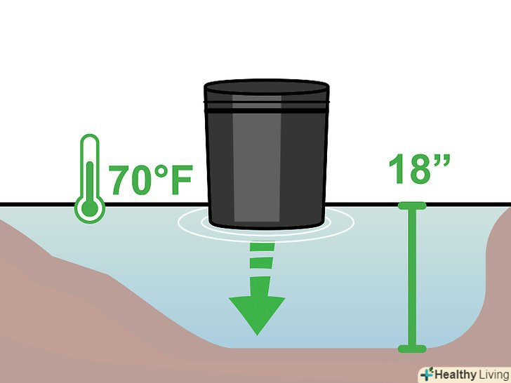 Опустіть ємність з насінням у воду. Лотос є водною рослиною, тому йому необхідний шар води над грунтом глибиною хоча б 5-10 сантиметрів. Якщо ви вирощуєте більш високі сорти лотоса, глибина води може досягати 45 сантиметрів. Карликовим лотосам необхідна глибина 5-30 сантиметрів. [9]- Температура води повинна становити щонайменше 21°C. Якщо ви живете в порівняно прохолодному кліматі, менший рівень води допоможе рослині зберегти тепло.