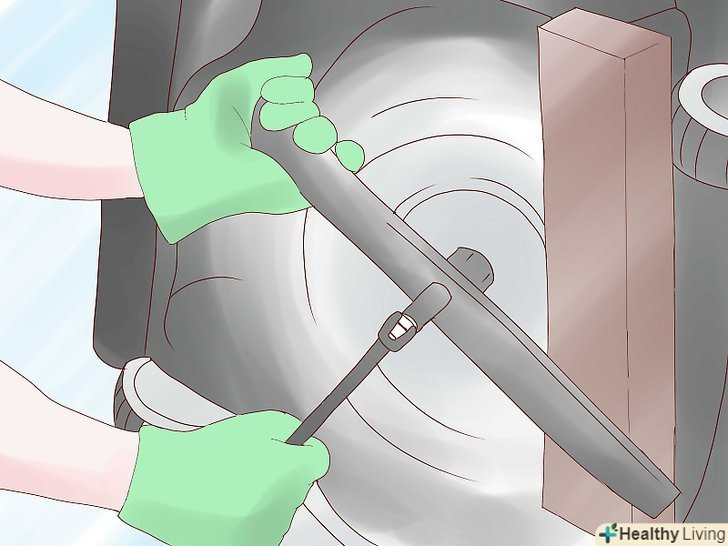 Переверніть газонокосарку на бік. гайковим ключем відкрутіть гайку або болт, щоб дістати леза з газонокосарки. Вставте гайковий ключ у центральний болт, яким леза кріпляться до газонокосарки. Візьміть звичайний молоток і злегка вдарте по гайковому ключу проти годинникової стрілки, поки не послабите болт. lt;- Помістіть дерев'яний брусок між лезами і нижньою частиною газонокосарки, щоб леза не рухалися, поки ви будете відкручувати болт або шуруп.