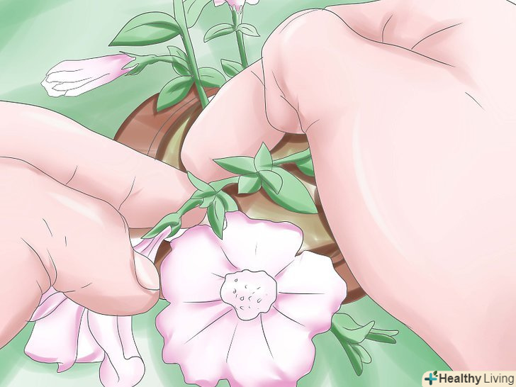 Відщипуйте кінчики стебел в середині літа. якщо стебла ваших петуній почали відростати і звисати до землі, то ви повинні відщипнути у них кінчики. Акуратно візьміть стебло і знайдіть самий товстий бутон в його верхній частині.- Відщипніть його великим і вказівним пальцями. В цьому випадку ви видаляєте активно зростаючу частину рослини, замість в'янучої.