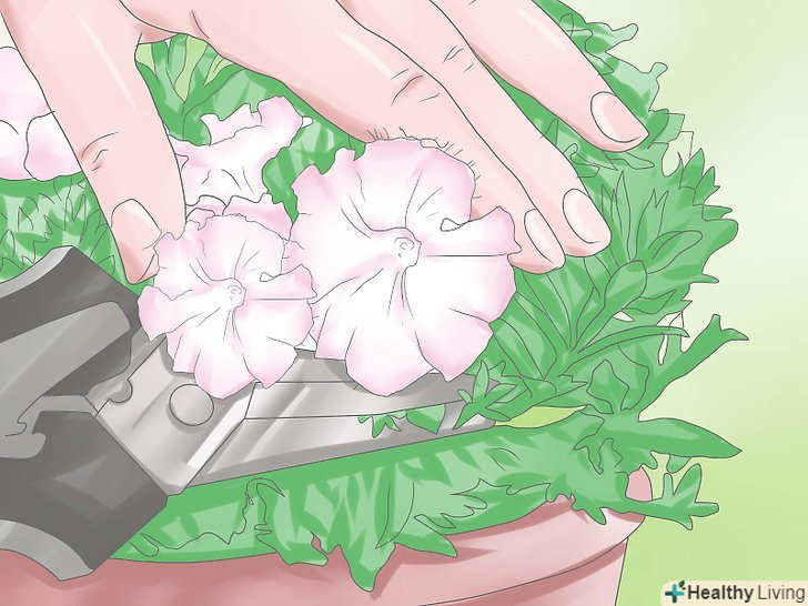 Якщо Петунія маленька, то обрізайте по одному стеблу в тиждень, а якщо рослина велика, то по 8-12 стебел. не обрізайте всі стебла відразу, щоб ваше рослина красивіше виглядало.- Іноді вам доведеться обрізати стебло зі здоровими квітками. Якщо стебло виріс занадто довгим і з великою кількістю мертвих квіток, то пожертвуйте здоровими квітками, щоб рослина цвіло довше.