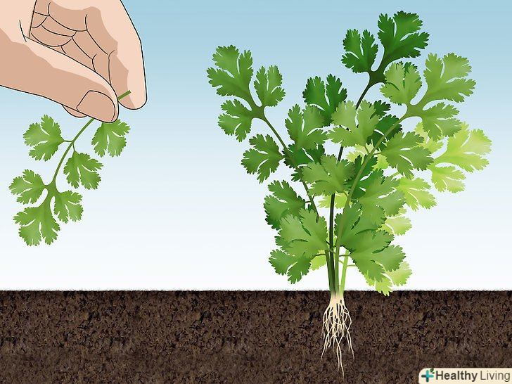 Зберіть урожай коріандру. зберіть його, відрізавши окремі листя і стебла з основи рослини, близько рівня землі, коли стебла виростуть висотою в 10-12 сантиметрів. У готуванні використовуйте свіжі пагони коріандру, а не старі, так як вони можуть гірчити.- Не відрізайте від рослини більше третини листя за раз, це може його послабити.