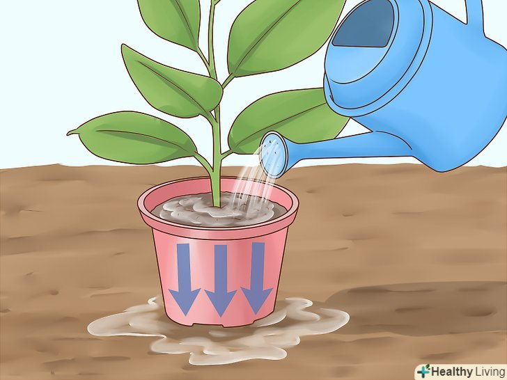 Використовуйте при поливі достатньо води, щоб вона текла з дренажного отвору в дні горщика. якщо грунт добре дренований, вам не доведеться турбуватися, що в горщику накопичиться зайва вода після поливу. Поливайте рослину так, щоб вода починала сочитися в піддон — в цьому випадку його коріння будуть отримувати достатньо вологи. [12]- У відкритому грунті як слід поливайте дерево протягом 5 хвилин, якщо на вулиці стоїть суха погода і листя поникли.