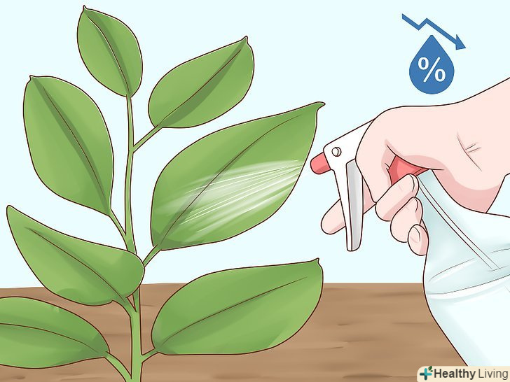 При низькій вологості повітря в приміщенні або на вулиці обприскуйте листя водою. якщо навколо сухе повітря, листя каучукового дерева можуть також стати сухими на дотик. Зазвичай для каучуконосів сухо при вологості повітря нижче 50%. У таких випадках акуратно обприскуйте рослину раз в день, щоб йому було комфортно. [13]- Використовуйте злегка теплу воду.