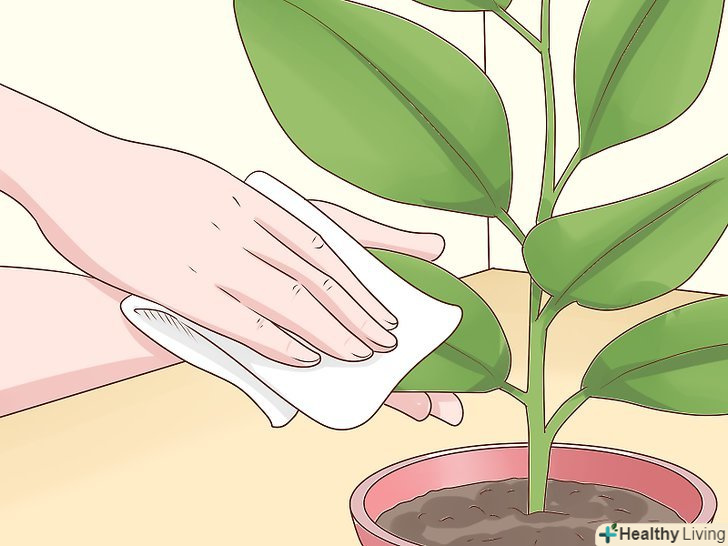 Витирайте пил з листя зростаючого в приміщенні дерева м'якою ганчіркою. як і на всьому іншому в приміщенні, на рослинах осідає пил. Змочуйте дуже м'яку ганчірку водою кімнатної температури і обережно витирайте кожен лист. [21]- Вода корисна для дерева, однак не використовуйте ніяких чистячих засобів, так як вони можуть пошкодити рослину.