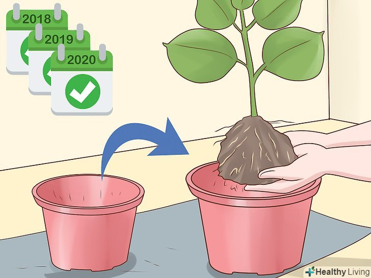 Пересаджуйте зростаючі в приміщенні дерева, коли їх коріння стане тісно в колишніх горщиках. При цьому коріння почнуть сплутуватися і впиратися в стінки горщика. [27] щоб визначити, чи не тісно коріння, візьміться за стовбур і потягніть його вгору. Якщо з горщика з'являється суцільний великий кому з кучерявими корінням зовні, рослині стало тісно.