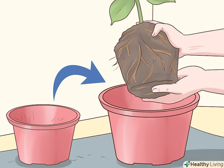 - Щоб пересадити дерево, насипте грунт на дно нового горщика. Візьміться за стебло рослини, витягніть його зі старого горщика разом з корінням і грунтом і опустіть в новий горщик. Засипте коріння грунтом так, щоб вона доходила до того ж рівня, що в колишньому горщику. Полийте дерево.