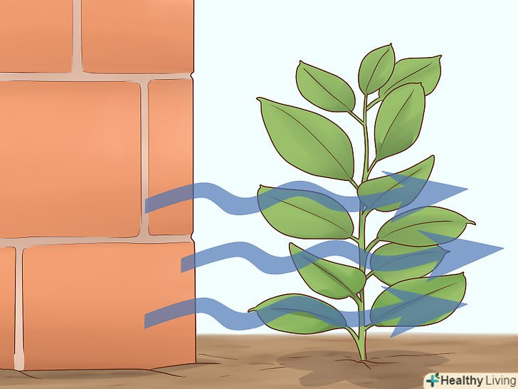 Виберіть захищене місце для посадки дерев у відкритий грунт. каучуковим деревам необхідний захист від вітру-посадіть дерево біля стіни або паркану. Визначте, в якому напрямку найчастіше дме вітер, і розмістіть дерево таким чином, щоб закрити його від вітру. [8]- Наприклад, в Південній Європі вітер часто дме з півдня або Заходу, тому можна посадити дерево біля північної або східної стіни будинку.