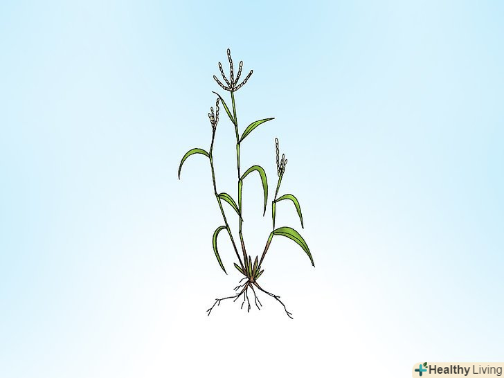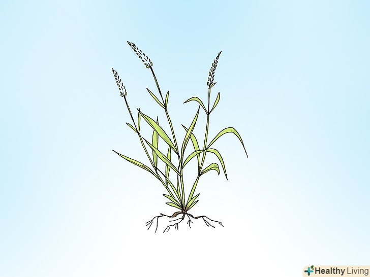 Придивіться до бур'яну. багато трав'янисті бур'яни мають загальні характерні риси, за якими ви з легкістю їх впізнаєте. Наприклад, трав'янисті бур'яни зазвичай мають малопримітні і не привертають уваги квіти. Їх листя зазвичай вузькі і стрічкоподібні з паралельними прожилками. Багато з них щільно згорнуті. [1]- Розгляньте стебло бур'яну. стебла трав'янистих бур'янів зазвичай круглі, але, як правило, це не показник. [2] на стеблах багатьох бур'янів цього виду є чітко окреслені вузли, до яких кріпляться листя. У багатьох різновидів стебла в середині порожнисті, крім вузлів.