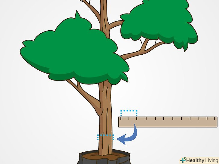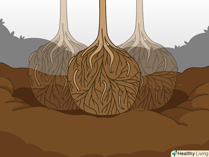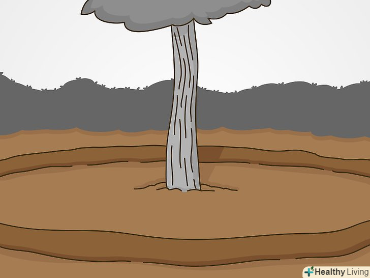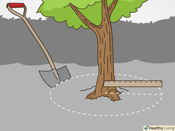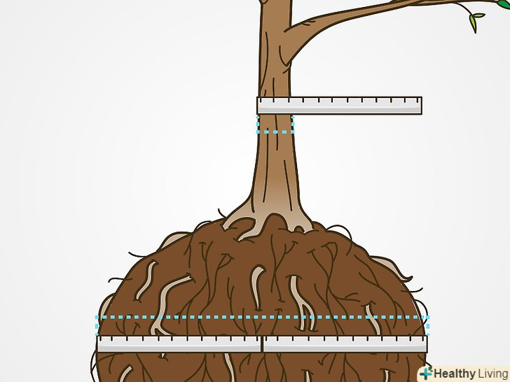 Оцініть радіус кореневого кома. кореневий кому дерева буде мати розмір близько 20-30 сантиметрів на кожні 2,5 сантиметра товщини стовбура на висоті грудей. Наприклад, якщо діаметр стовбура 2,5 сантиметра, діаметр кореневої грудки буде дорівнює приблизно 20-30 сантиметрів. [8]- Можна виміряти розмір кореневої грудки після вилучення з землі. Однак попередня оцінка дозволить вам заздалегідь зрозуміти, наскільки далеко від стовбура вам потрібно буде копати, щоб не зачепити коріння.