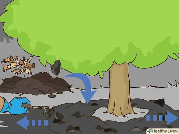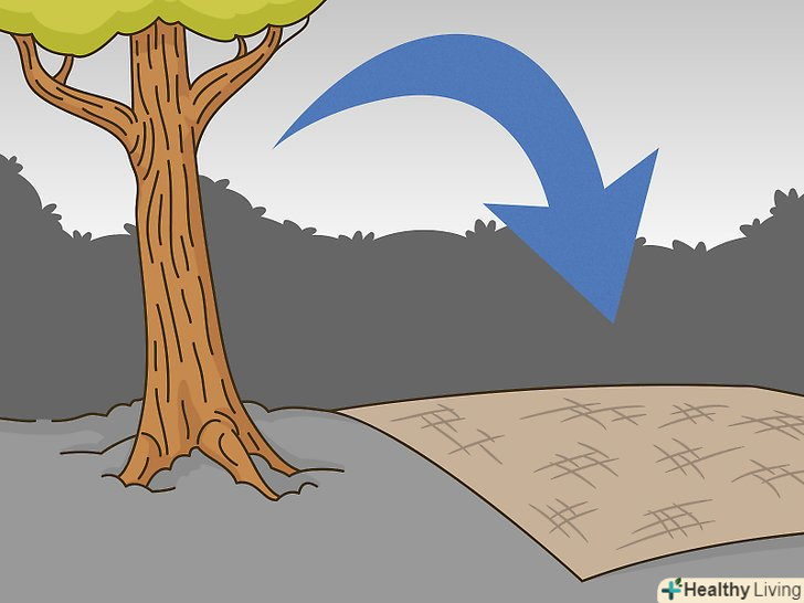 Насипте 7-15 сантиметрів мульчі до основи стовбура. розподіліть її навколо дерева в радіусі від 1 до 2 метрів. Мульча не повинна стикатися зі стовбуром. [14]- Мульча створює сприятливі умови для росту коренів, покращуючи якість поливу, затримуючи вологу і запобігаючи росту бур'янів.