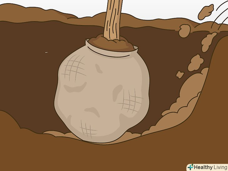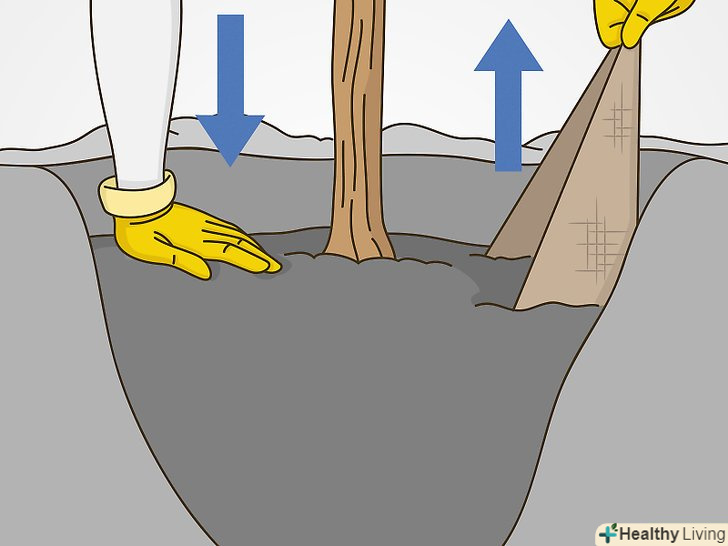Наповніть яму землею і розрівняйте поверхню. коли яма буде заповнена на дві третини, утрамбуйте землю навколо стовбура руками, щоб прибрати зайве повітря. Якщо ви перевозили дерево в брезенті, розв'яжіть мотузку і витягніть брезент з-під коренів. Потім продовжуйте наповнювати яму землею. [12]- Повільно і ретельно полийте дерево після того, як заповніть яму землею. Такий полив захистить дерево від пересихання.
