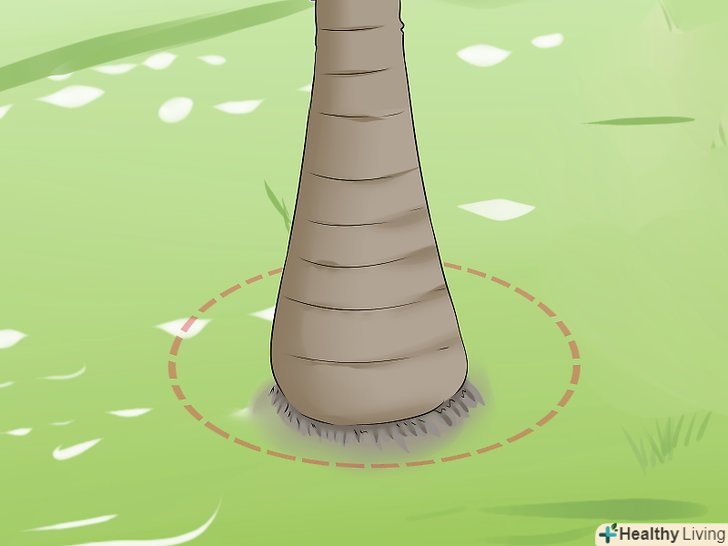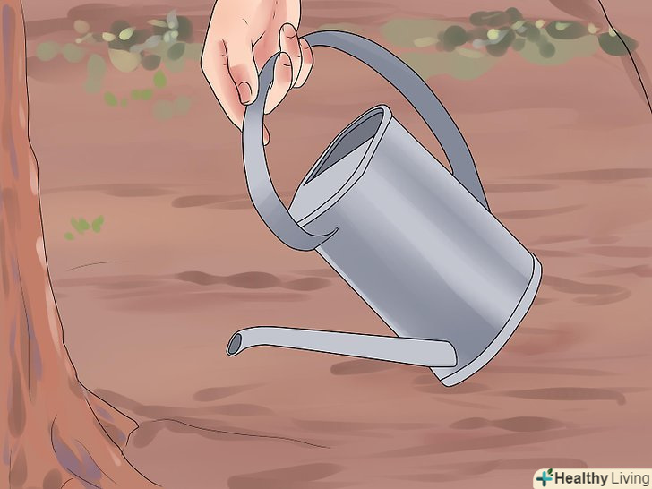Ретельно поливайте дерево. Можете зробити невелику земляну насип навколо кореневої грудки, щоб вода залишалася в області коренів під час поливу, особливо якщо дерево знаходиться на схилі пагорба або в землі, яка погано вбирає воду. Мульчування основи дерева також допоможе підтримувати грунт зволоженою. Нанесіть шар близько 7,6 см нещільної мульчі.