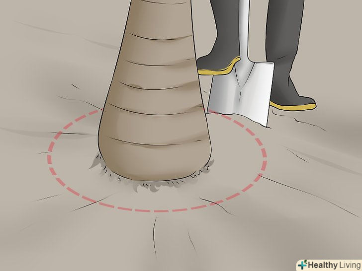 - Перевірте яму. Вона повинна бути досить глибокою, щоб верхня частина кореневого кореня ледь покривалася землею після висадки, але не настільки глибокою, щоб стовбур набирав багато вологи і гнив. Відкриті коріння-це добре, але засипання грунтом виступає кореневої корони неприпустимо. Кажуть, що пальма з виступаючим на поверхні коренем ніби «стоїть навшпиньки» і менш стійка. З іншого боку, якщо пальму закопувати занадто глибоко, у неї може початися гниття стовбура. Через хвороби і гниття дерево також може стати нестійким.