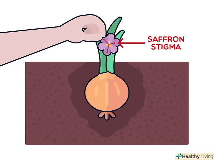 Висмикніть рильця з кожної квітки. у центрі кожного фіолетового квітки крокусу ви знайдете 3 помаранчевих або червоних рильця. Дочекайтеся сонячного дня, коли квіти повністю розкриються, і пальцями акуратно висмикніть ці рильця з квітки. [11]