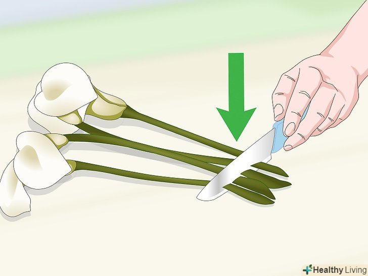 Порівняйте стебло з вазою, щоб побачити, якої довжини його зрізати. Виміряйте кали з обраної вазою, щоб визначити, де найкраще зрізати їх. Зріжте їх, щоб вони могли виступати з верхньої частини Вази, в той же час, упевнившись, що їх стебла залишаються у воді.- Використовуйте гострий чистий ніж, щоб зрізати стебло під кутом 45 градусів.