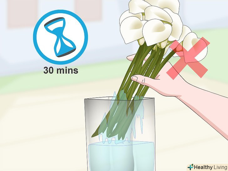 Розгорніть придбані кали, як можна швидше, щоб запобігти висиханню. Якщо ви придбали або вам подарували кали, розгорніть їх якомога швидше. Відразу ж після розпакування, поставте їх швидко в воду.- Якщо ви не в змозі зробити це, покладіть їх в прохолодному, тьмяно освітленому місці, наприклад, підвалі, поки ви не зможете подбати про них.