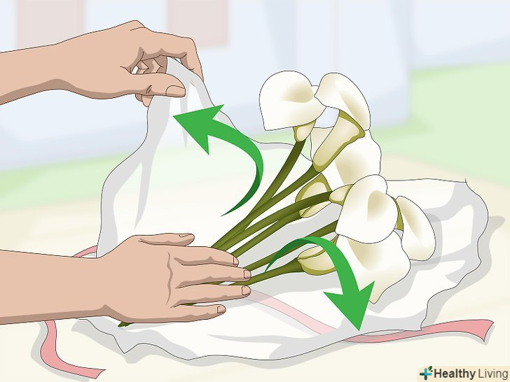 Не зрізайте лілії, поки не потребуєте їх, щоб зберегти їх красу. якщо ви використовуєте кали як частину весільного букета, нехай стоять у вазі в прохолодному місці 30 хвилин, перш ніж вони вам знадобляться. Вийміть їх з води за 30 хвилин до використання, щоб вода не накапала на одяг.- Може бути гарною ідеєю занурити зрізані кінці в розплавлений віск, щоб допомогти запечатати їх.