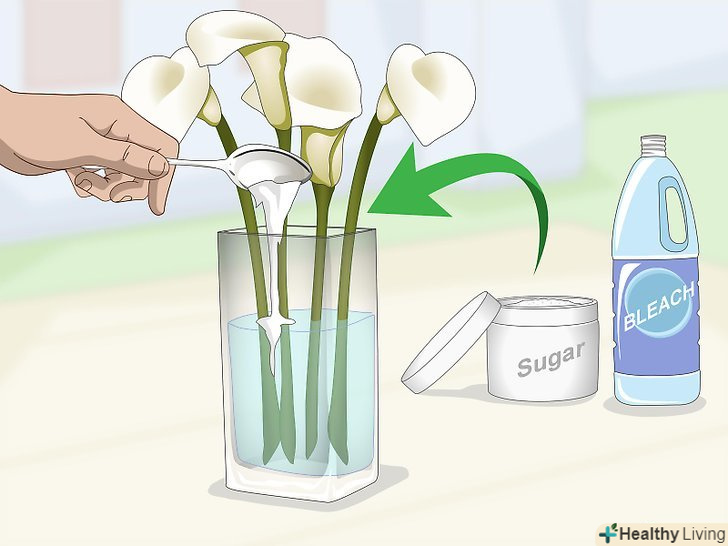 Підгодуйте квіти, щоб забезпечити їх здоров'я. додайте підгодівлю для квітів у вазу з водою або, якщо у вас немає, чайну ложку цукру і одну-дві краплі відбілювача на кожні два літри води.- Деякі люди радять використовувати краплю спрайту або 7-Ап.