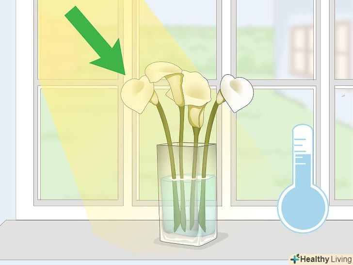 Поставте вазу з каллами в хорошому місці, щоб зберегти їх здоровими. Каллам найкраще в прохолодній кімнаті, в якій не дуже світло і далеко від прямих сонячних променів або інших джерел тепла таких, як радіатори.- Не ставте їх поруч з телевізором або комп'ютером, так як ці місця можуть нагрітися при тривалому використанні.