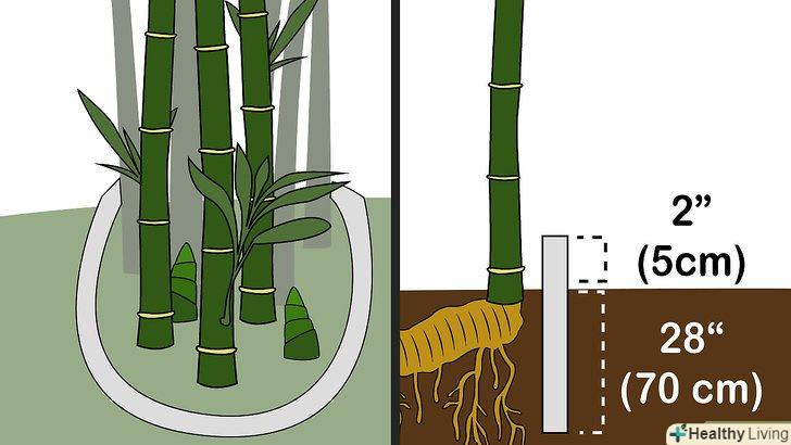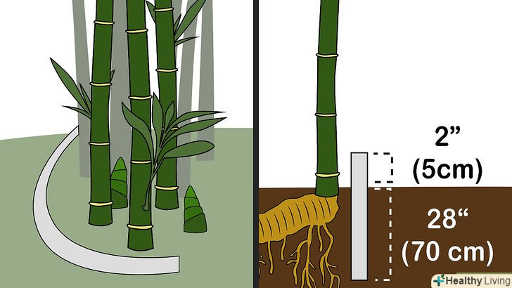 Огорожа без однієї стінки. огорожа повинна входити в землю на глибину не менше 60-90 см, що більше глибини зростання ризом. До переваг огорожі без однієї стінки відноситься обмеження розростання коренів в закритому просторі, а також наявність необхідного дренажу. Також його можна використовувати для обмеження зростання уздовж лінії паркану або межі ділянки, завдяки чому вам бамбук не почне рости у сусідів і навпаки. [6]- Якщо є бажання помайструвати своїми руками, то можна зробити огорожу з бетону, металу або пластику. Будь-який з цих матеріалів підійде. Слід знати, що ризоми можуть проростати крізь деревину. Тому не слід виконувати огорожі з дерева.