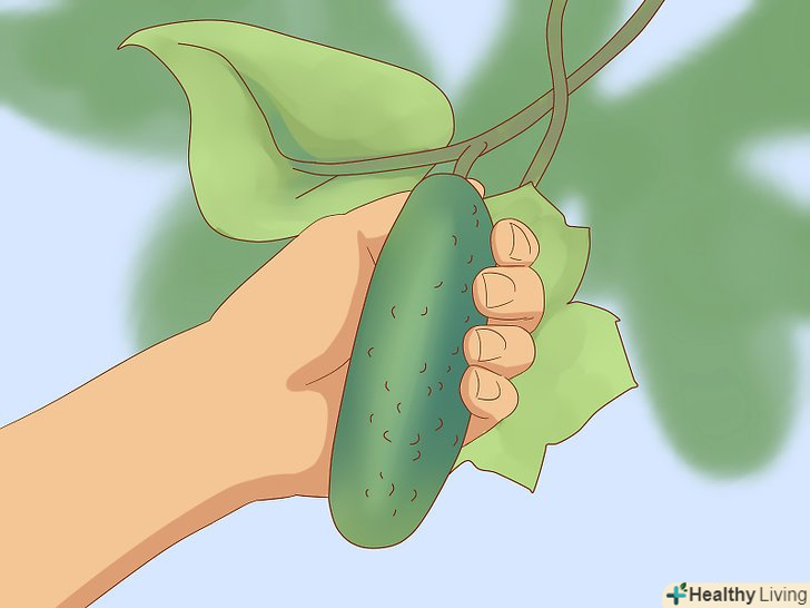 Акуратно зрізайте огірки садовими ножицями. візьміться за огірок і зріжте стебло приблизно на 0,5 сантиметра вище плоду. Багато хто вважає, що досить потягнути або покрутити огірок, щоб зірвати його. Однак при цьому можна пошкодити лозу. [26]
