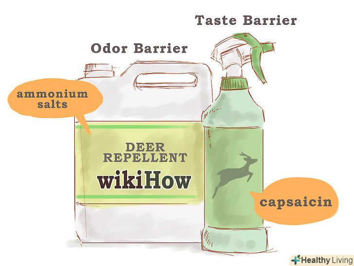 Купуйте готовий репелент від оленів, що продається в будівельних магазинах, збройових магазинах, великих супермаркетах і в Інтернеті.- Шукайте репелент, який забезпечує бар'єр від запаху. Вони часто бувають у вигляді порошку, кристалів або спреїв, з вмістом солі амонію.