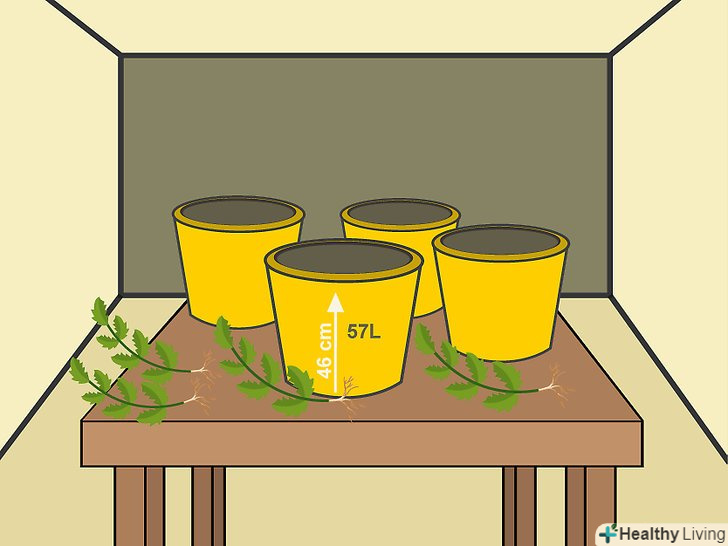 Виберіть для кожної рослини горщик об'ємом близько 60 літрів і діаметром 45 сантиметрів. це мінімальні розміри, необхідні для нормального росту помідорів. Деякі низькорослі сорти, такі як "бонсай", можуть рости і в горщиках діаметром 30 сантиметрів, проте в цьому випадку їх коріння будуть обмежені, і урожай може виявитися невеликим. [3]