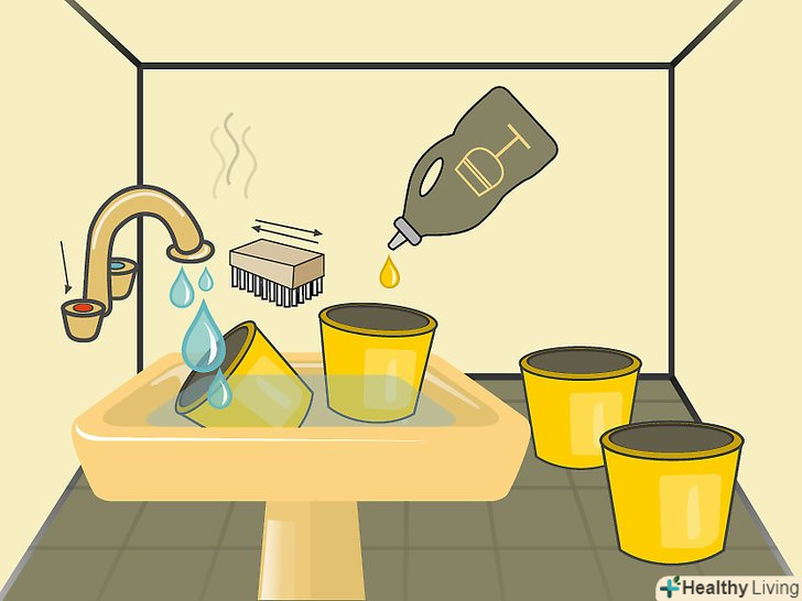 Як слід вимийте горщики гарячою водою з милом. навіть якщо ви придбали нові горщики, перед посадкою рослин їх необхідно очистити. Хлюпніть в кожен горщик трохи рідкого мила і залийте його гарячою водою. Зачекайте хоча б 5 хвилин, поки мило подіє, потім ретельно обполосніть горщики чистою водою, щоб видалити всі залишки миючого засобу. Після цього як слід висушіть горщики.- Тим самим ви знизите ризик того, що в горщиках залишаться шкідливі бактерії або яйця комах.