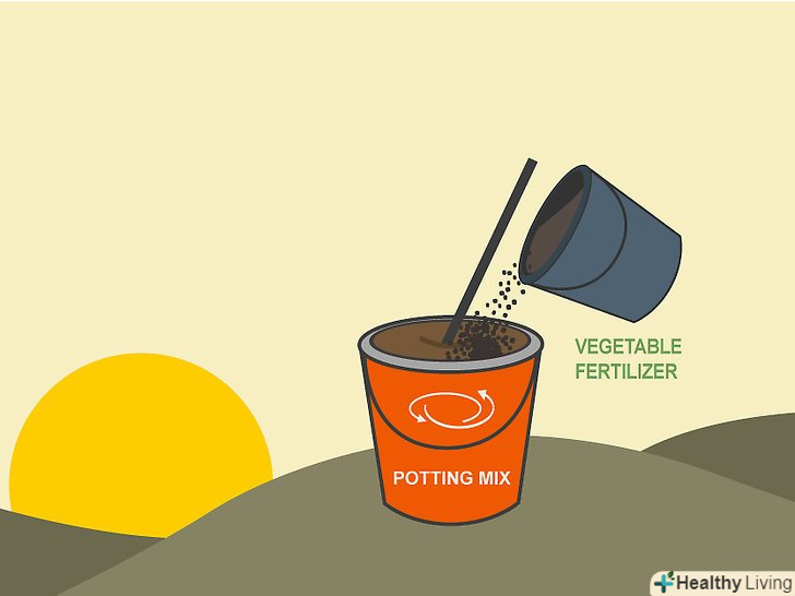 Змішайте грунт і добриво для овочів. придбайте в магазині товарів для саду та городу універсальний грунт для кімнатних рослин і пакет добрива для овочів. Відповідно до вказаних на пакеті інструкцій додайте добриво в грунт. [5]- Ні в якому разі не використовуйте звичайну грунт зі свого саду або городу. Такий грунт може містити бактерії та інших шкідників, небезпечних для рослин і саджанців.