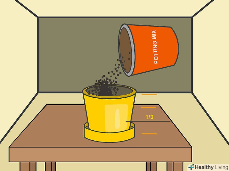 На 1/3 заповніть горщик грунтовою сумішшю. якщо ви використовуєте шістдесятилітровий горщик, засипте землю так, щоб вона покривала дно на 15-20 сантиметрів. В результаті для рослини залишиться достатньо місця, і ви зможете оточити його додаткової грунтом. Не насипайте багато землі з самого початку, інакше занадто велика частина рослини опиниться під палючим сонцем, що може пошкодити молоді саджанці. [8]- Якщо ви збираєтеся вирощувати помідори з насіння, насипте в горщик землю так, щоб її рівень не доходив до країв горщика приблизно на 1,5 сантиметра. Якщо посадити насіння глибше, вони можуть не зійти.