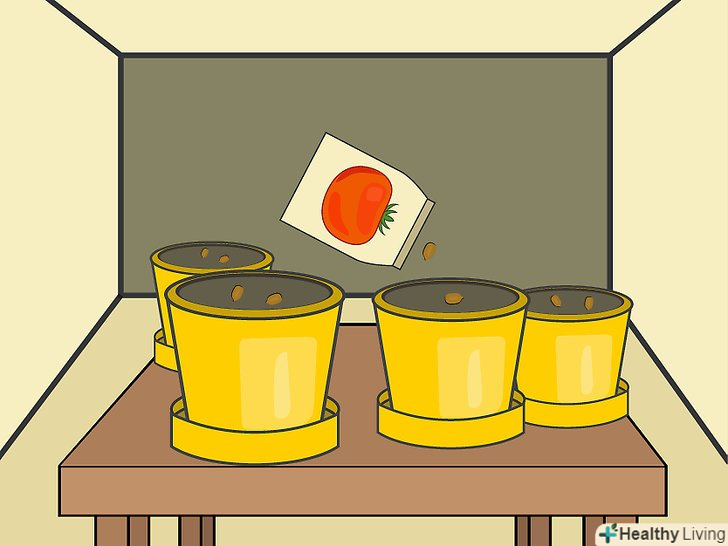 Якщо ви збираєтеся вирощувати помідори з насіння, помістіть в центр кожного горщика 2 насіння. Зробіть в самому центрі горщика крихітну ямку глибиною близько 0,5 сантиметра. Опустіть в ямку 2 насіння і присипте їх землею. Насіння повинні бути повністю прикриті грунтом. [9]- Якщо ви посадите 2 насіння, то збільшите шанс того, що хоча б одне з них зійде.
