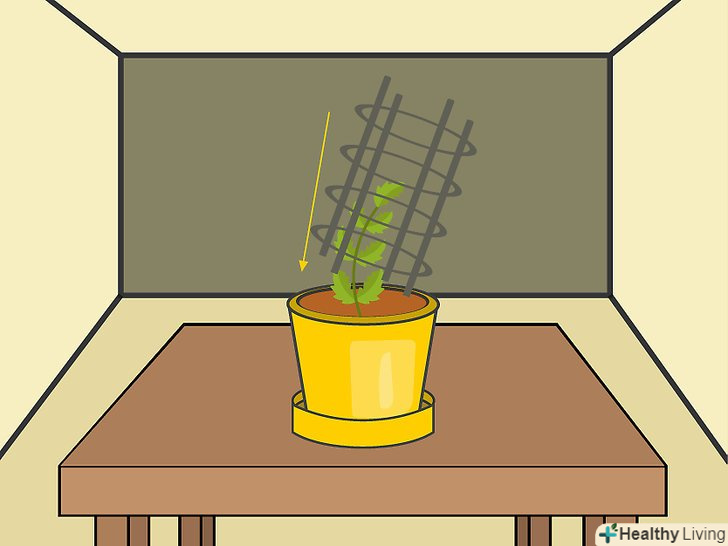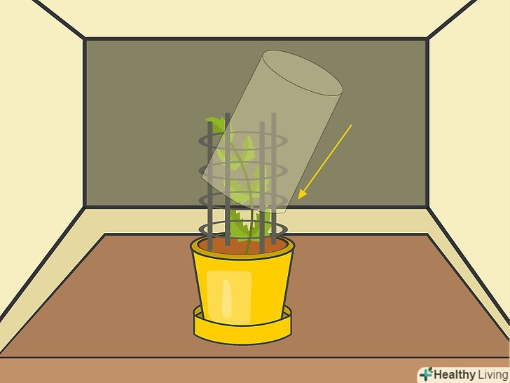 Після того як ви поллєте рослина, встановіть в горщику підтримуючу решітку. обережно вставте ніжки решітки в землю, так щоб вона оточувала рослину. Як слід закріпіть решітку. Якщо ви відчуєте, що її ніжки в щось вперлися і не дійшли до дна горщика, трохи змістите їх і опустіть нижче. Не тисніть на решітку занадто сильно, щоб не пошкодити коріння. [12]- Як правило, решітки для помідорів роблять з дроту для армування бетону. Такі решітки можна придбати в магазині товарів для саду та городу.